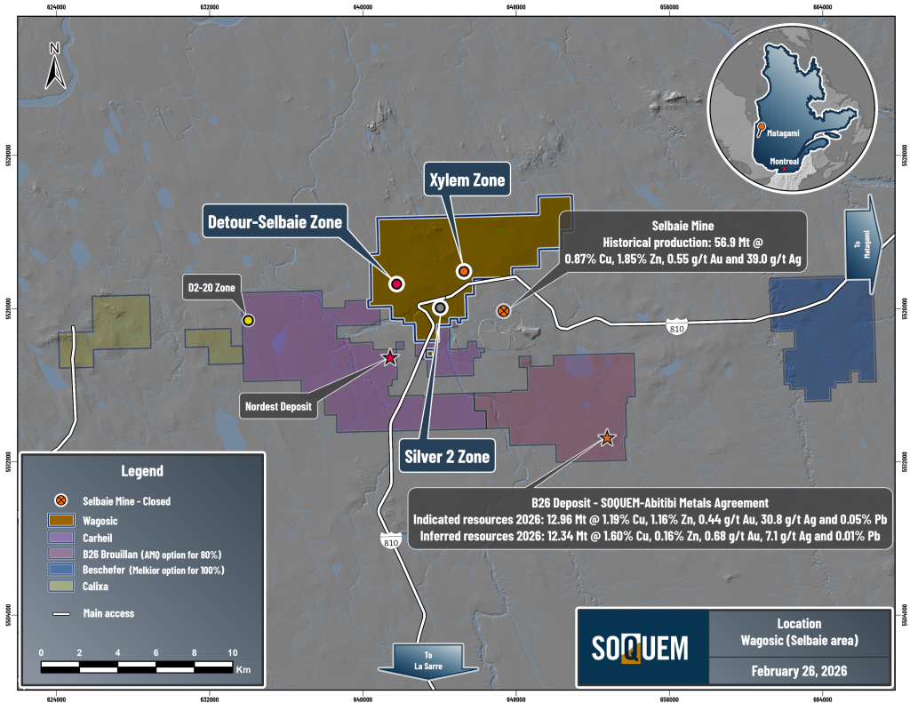 Val-d’Or, February 27, 2026 – SOQUEM, a subsidiary of Investissement Québec, is pleased to present an update and preliminary results for the ongoing exploration drilling campaign on its Wagosic Project. The wholly owned project lies roughly 90 km west of Matagami, near the former Selbaie mine (56.9 Mt at 0.87% Cu, 1.85% Zn, 0.55 g/t Au, 39 g/t Ag; CONSOREM, 2012).