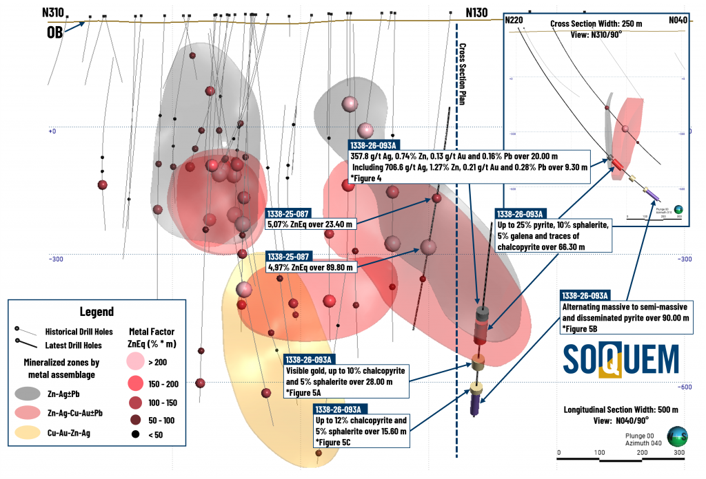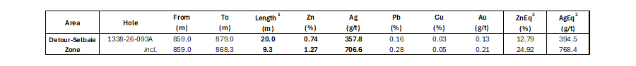 o Extension identified at a distance of 230 m from a large stockwork zone previously intersected in 2024 and 2025 on the Detour-Selbaie Zone. Hole 1338-26-093A intersected the first mineralized interval at a depth of 857.35 m, returning 357.8 g/t Ag, 0.74% Zn, 0.13 g/t Au and 0.16% Pb over 20.00 m, including 706.6 g/t Ag, 1.27% Zn, 0.21 g/t Au and 0.28% Pb over 9.30 m. The interval contains several quartz-sulphide-native silver veinlets and 1.70 m of semi-massive sulphide (pyrite-sphalerite-galena-chalcopyrite).