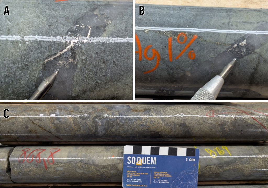Figure 4. A and B: Examples of quartz-sulphide-native silver veins intersected between 857.35 m and 865.95 m in hole 1338-26-093A. C: A 1.70-m portion of semi-massive pyrite-sphalerite-galena-chalcopyrite mineralization starting at a depth of 865.95 m in the same hole.