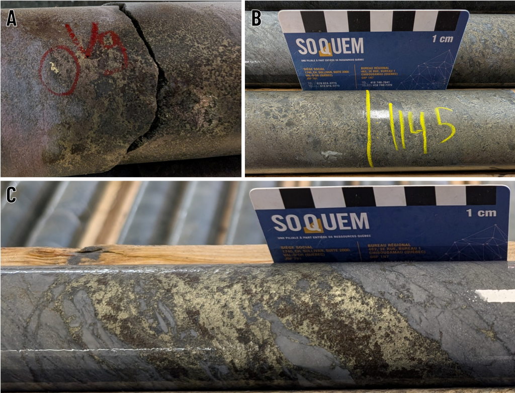 Figure 5. A: Occurrence of visible gold accompanied by chalcopyrite in hole 1338-26-093A at a depth of 1,020.50 m. B: Example of massive pyrite intersected at a depth of 1,145 m in the same hole. C: Example of chalcopyrite, sphalerite and pyrite mineralization at a depth of 1,129 m, close to the massive pyrite horizon.
